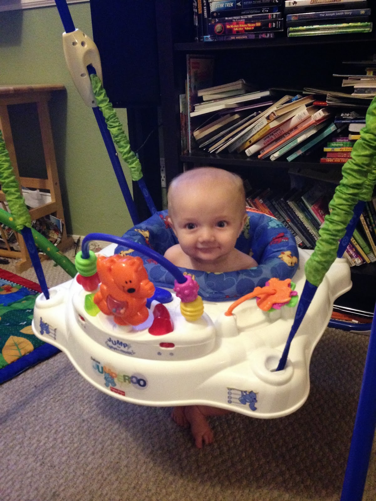 He has been saying Mama for months now but I try not to count my kids talking early because well the all talk extremely early but the other day he was saying mama and I looked over and he smiled and said Mama. So even though he has been saying it since he was 3 months old I officially count it at 6 months. Doug on the other hand thinks we should could it at three months since he was rolling around at one month as well.